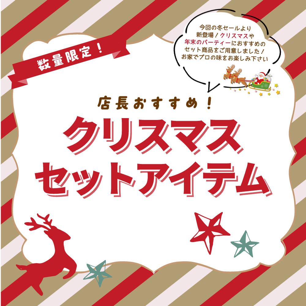 今回もご好評頂いております「予約のお客様限定!お得なセット商品」をご用意しました!単品購入よりさらにお買い得となりますので、お見逃しなく!さらに、店長おすすめアイテムとしてクリスマスや年末のパーティーにぴったりなセットもご用意♪数量限定となりますので、ご予約が確実です!!お見逃しなく。
